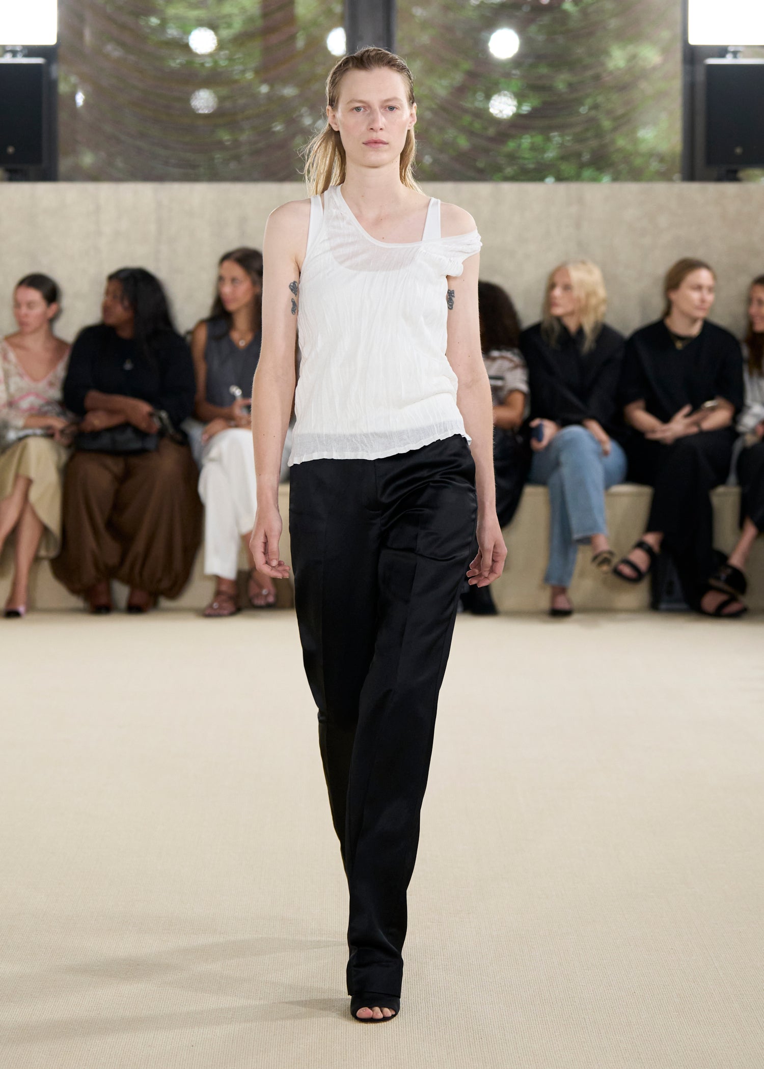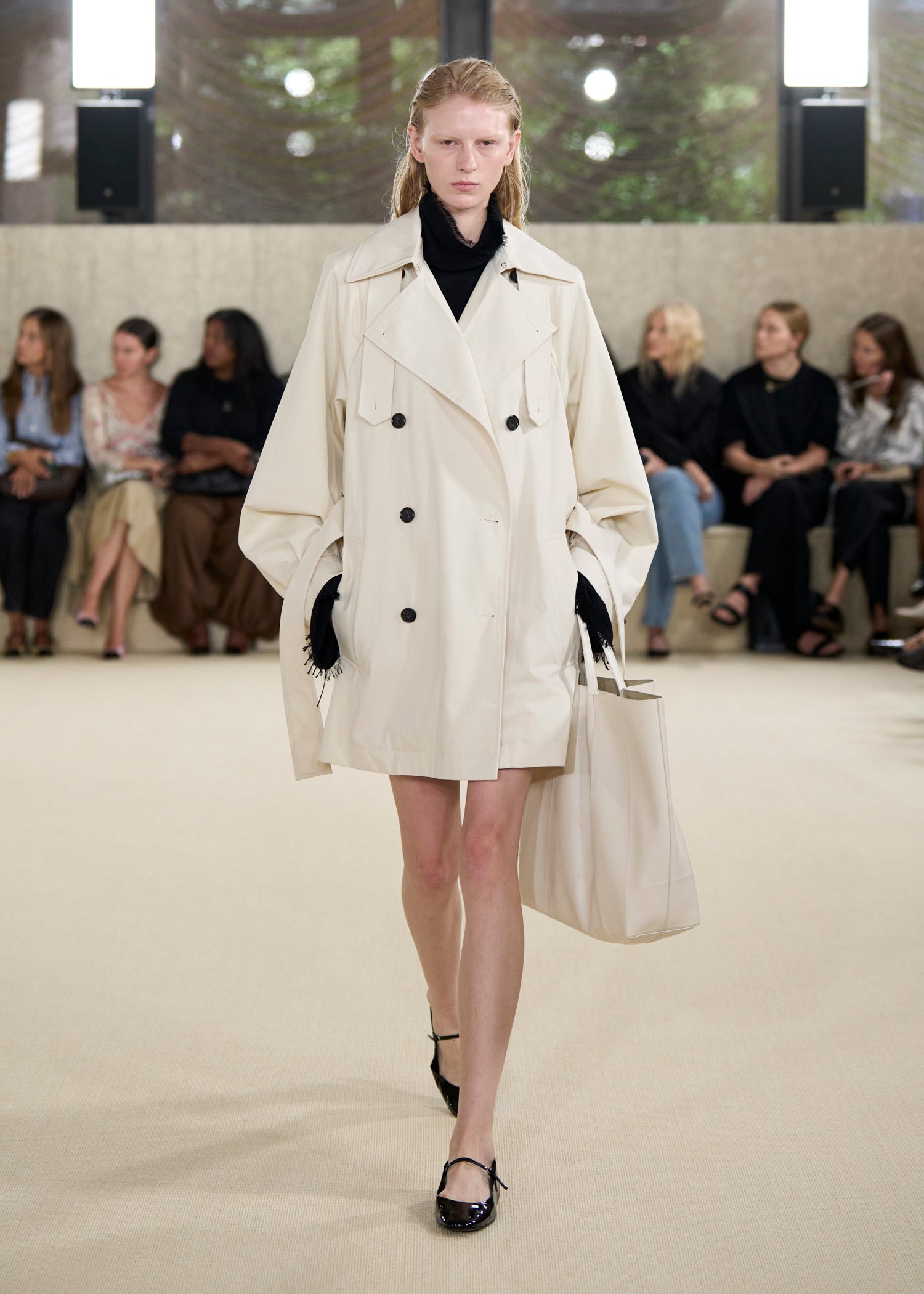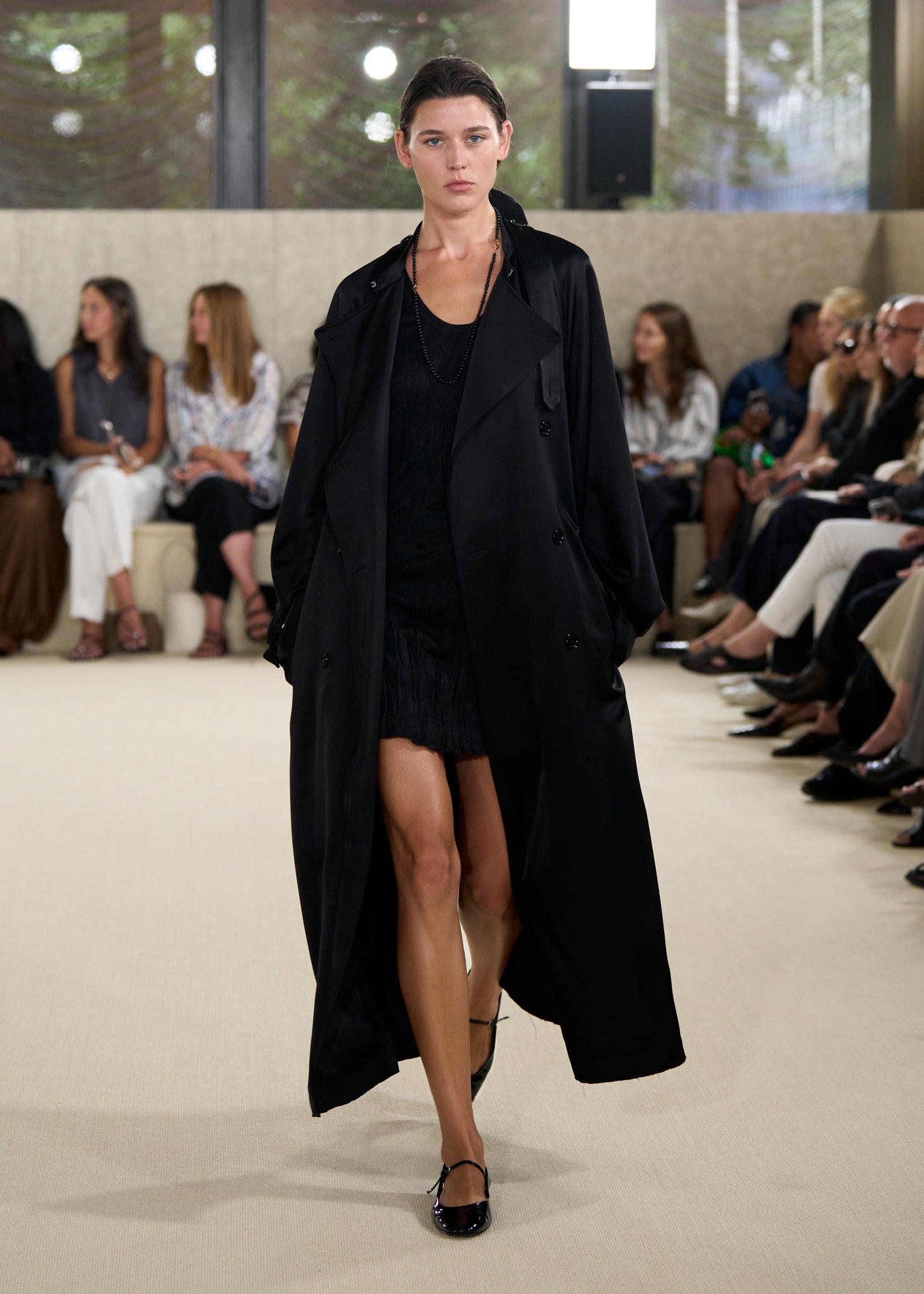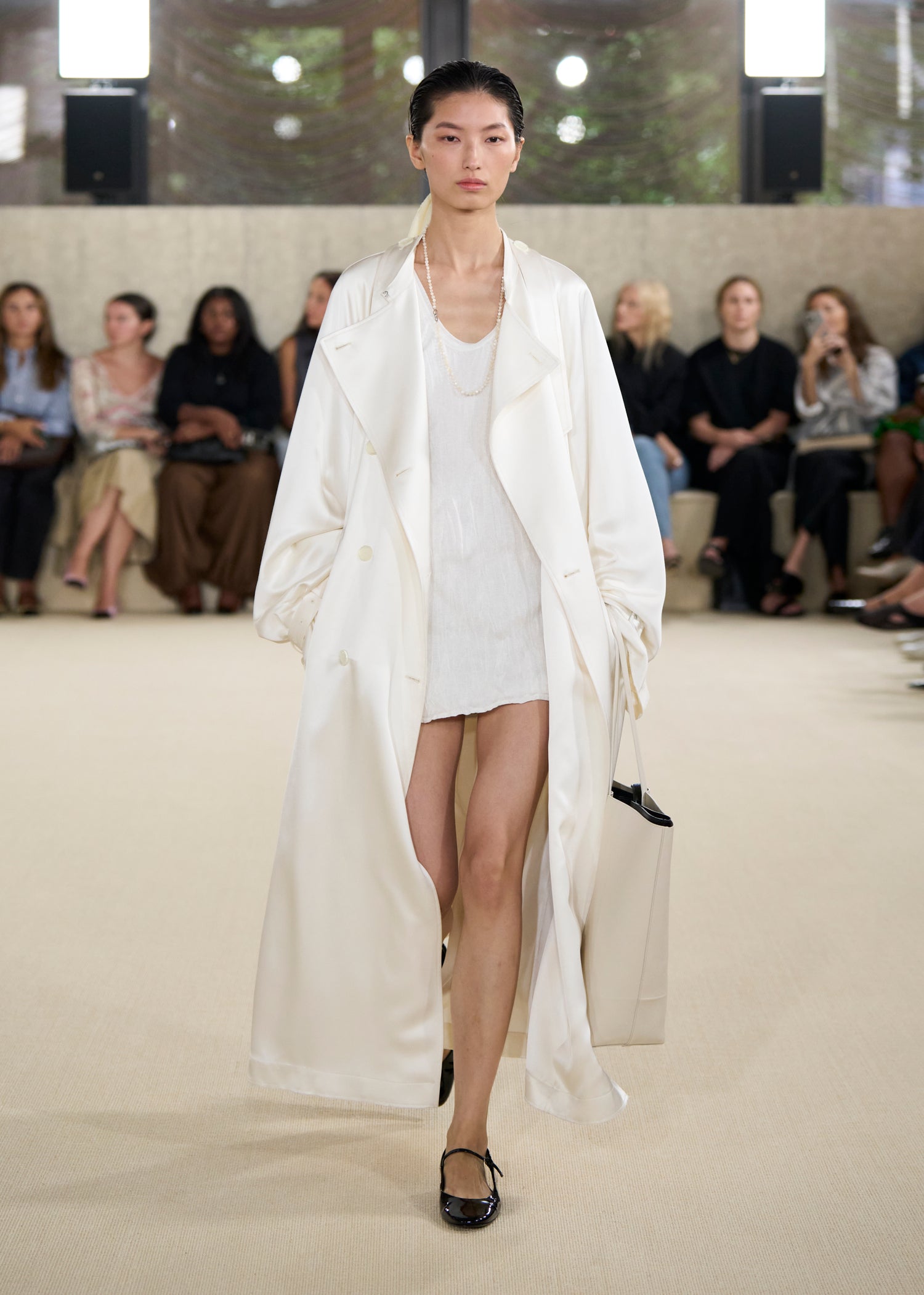 The Spring Summer 26 runway collection distills undone beauty. TOTEME icons like the tank, trench coat and pajama are deconstructed with easy-going precision, unravelling finishes, and a liberating mix of time-softened textures.