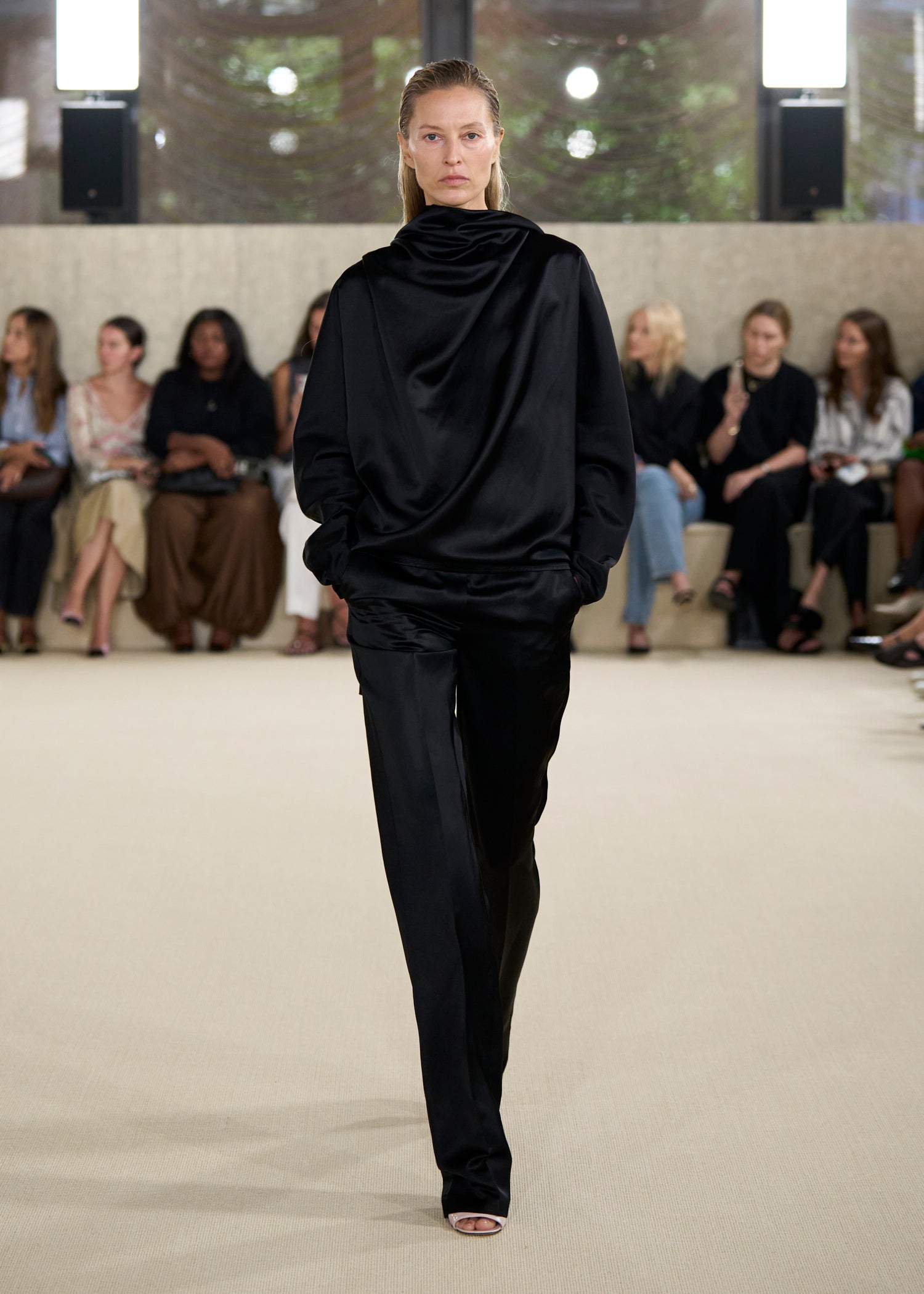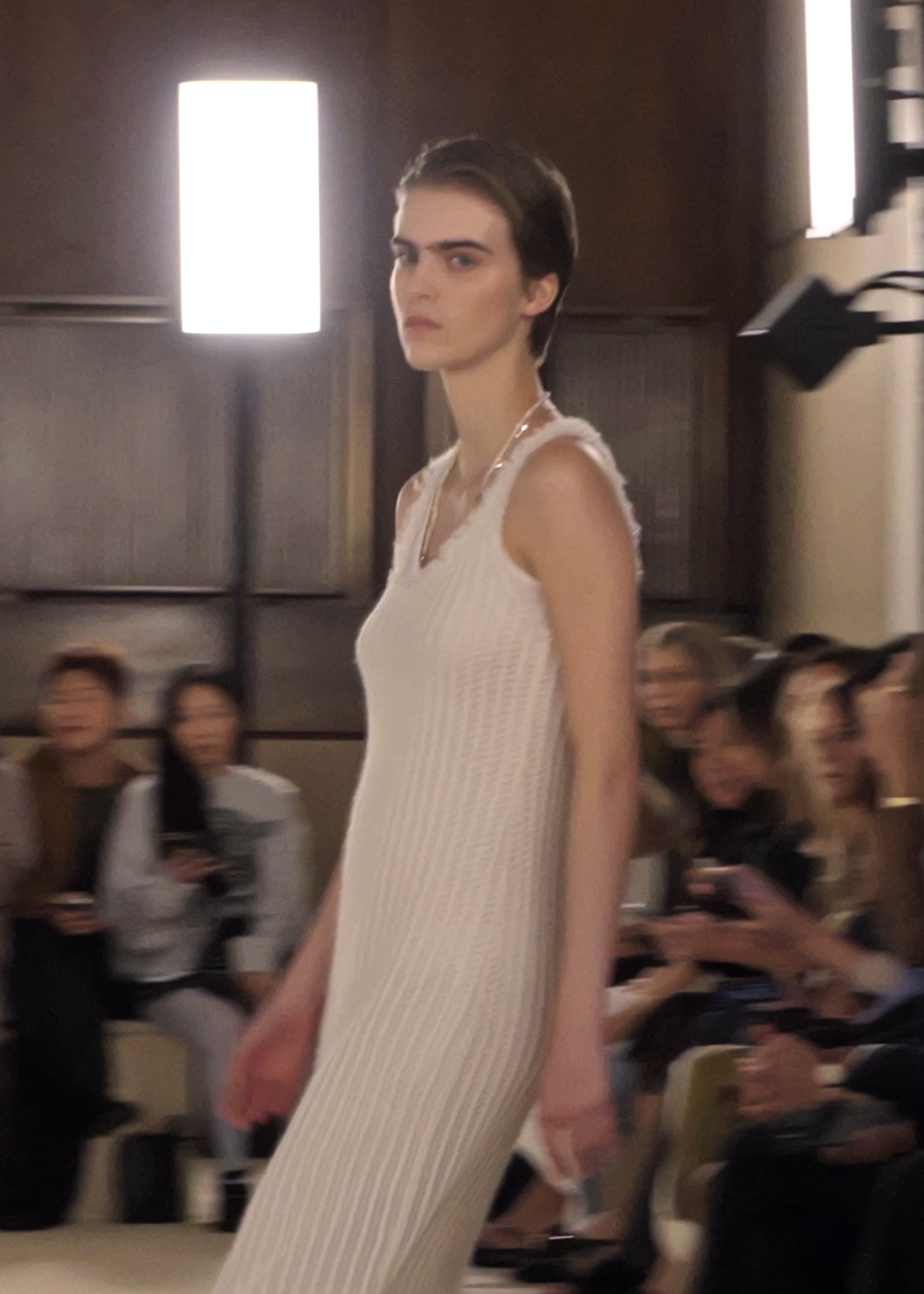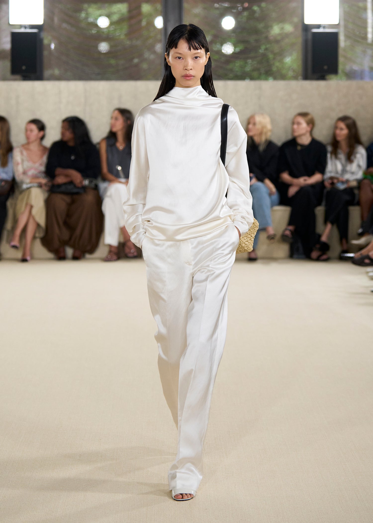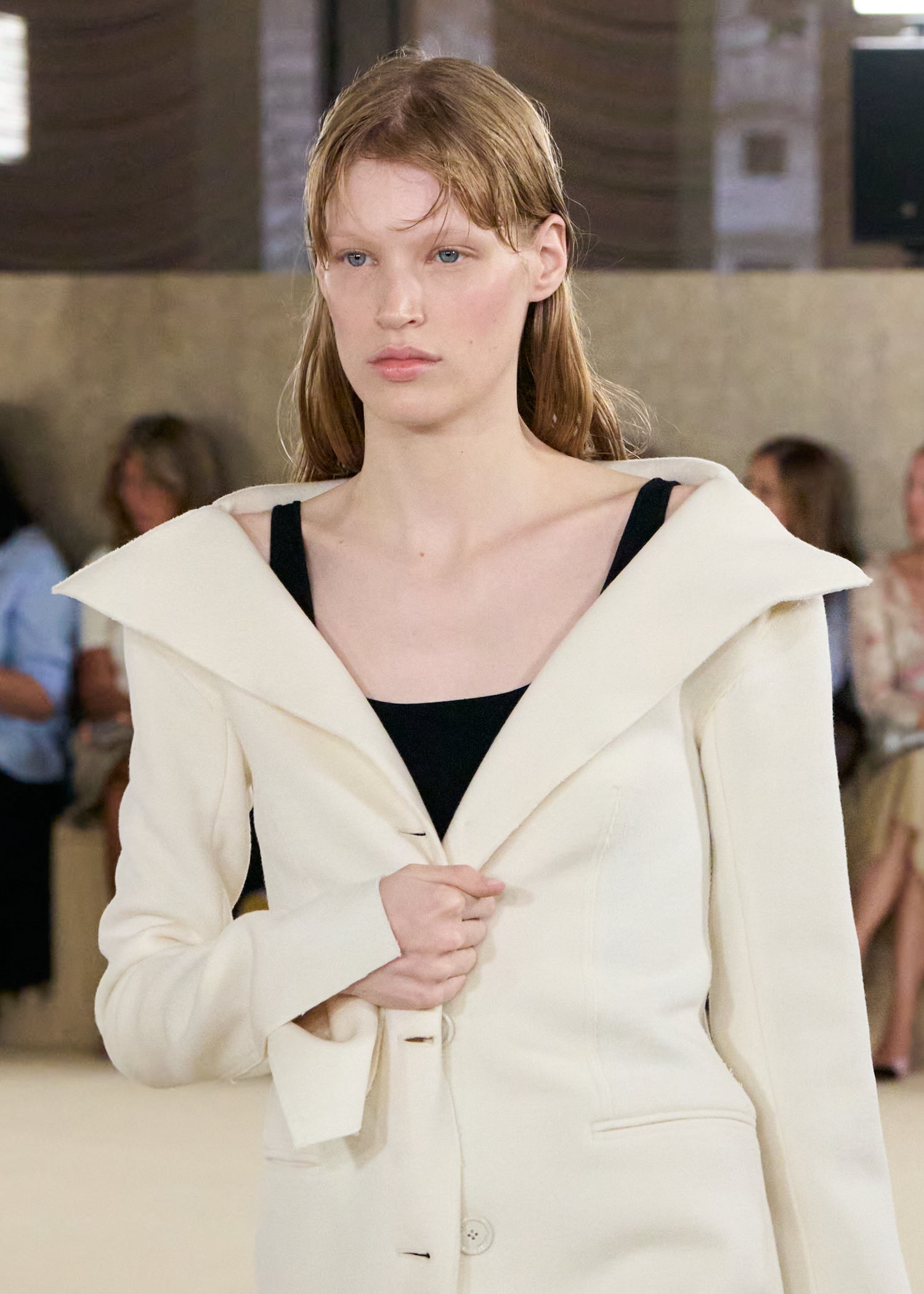 The Spring Summer 26 runway collection distills undone beauty. TOTEME icons like the tank, trench coat and pajama are deconstructed with easy-going precision, unravelling finishes, and a liberating mix of time-softened textures.